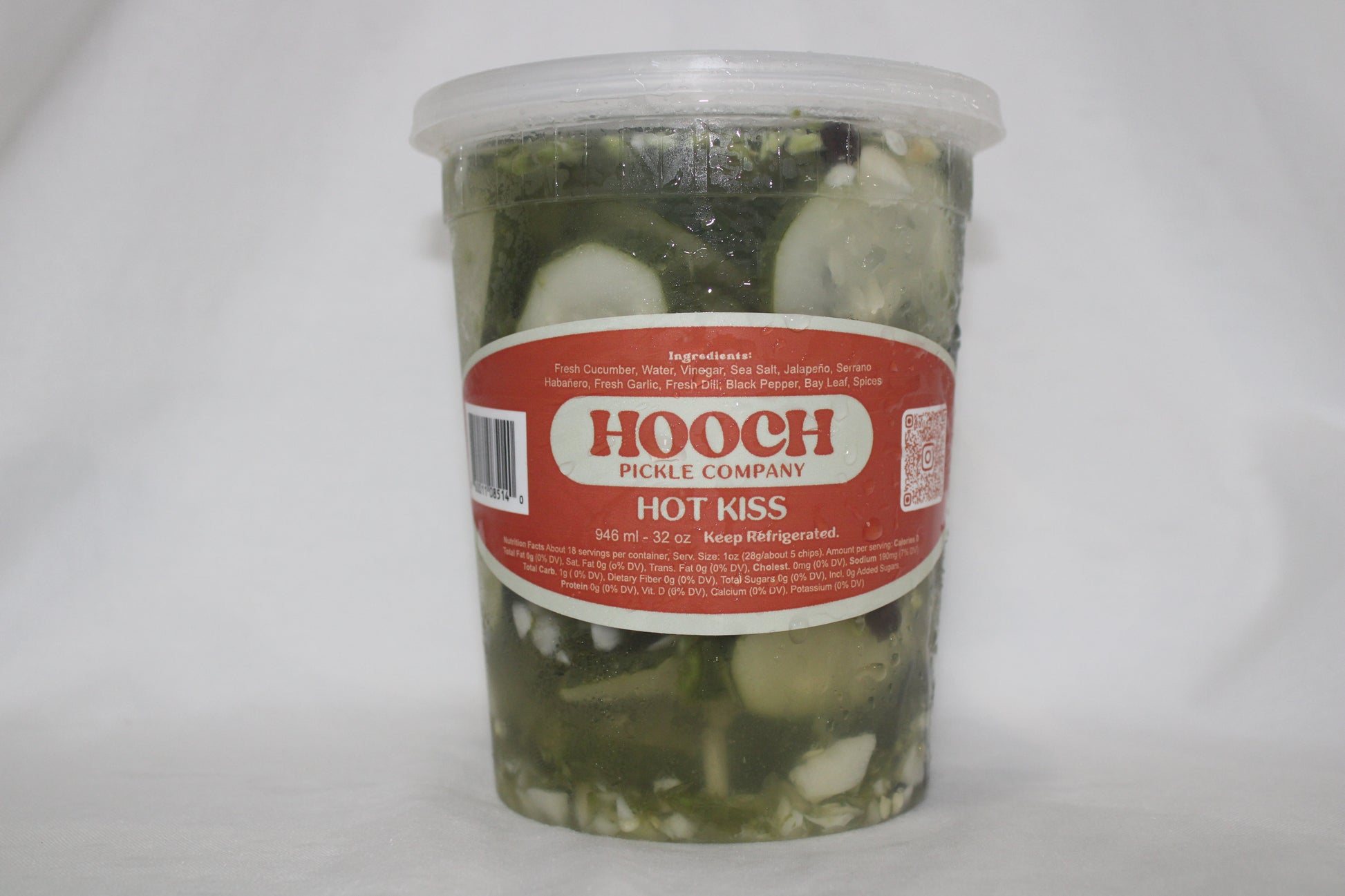 Our Hot Kiss pickles are the newest member of the legends. Hot Kiss promises to bring the heat, leaving your lips toasty as you lick them after enjoying the crunching, fresh flavor of fresh jalapeños, serrano, and habanero peppers.